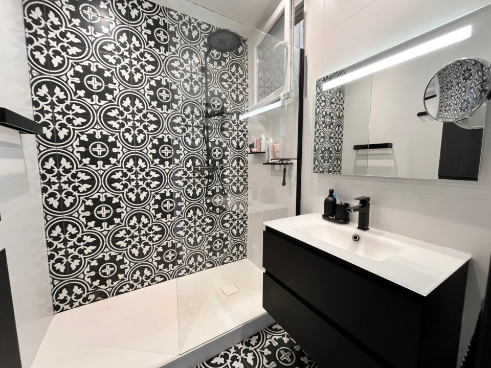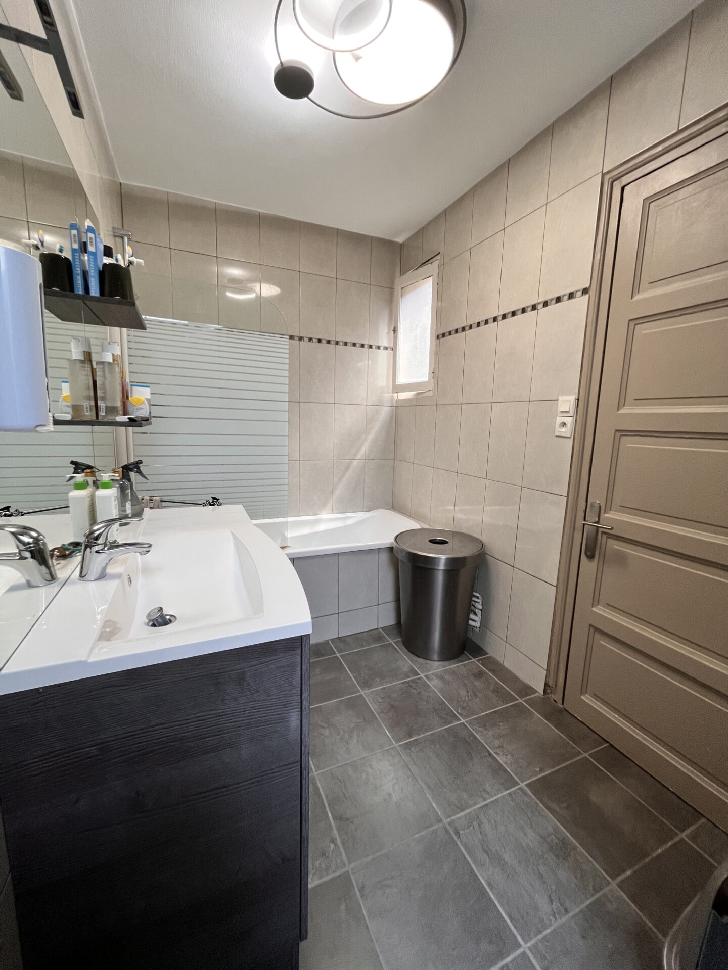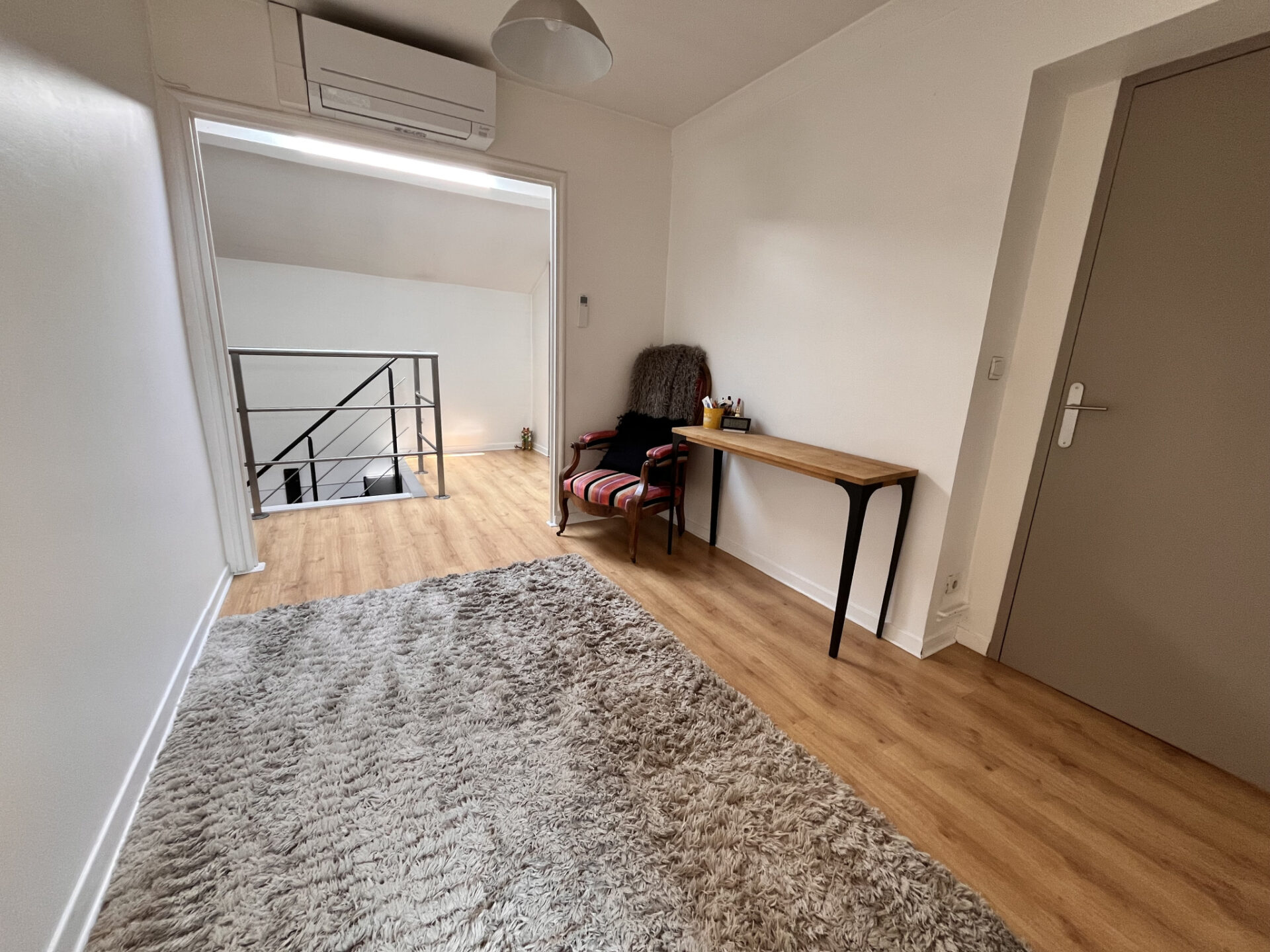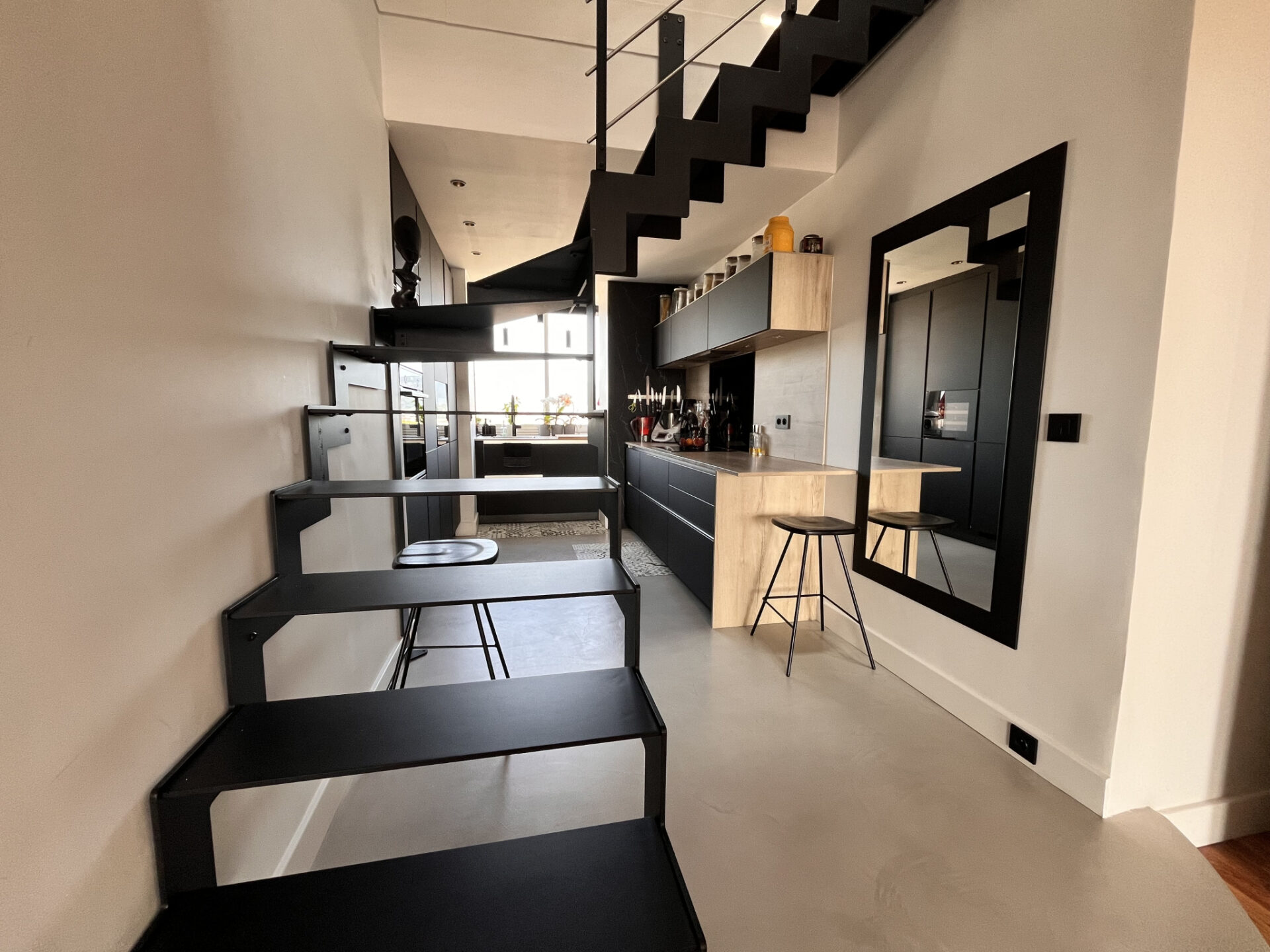 Un escalier design, véritable pièce maîtresse, mène à trois chambres supplémentaires, une salle de bain avec wc, une buanderie et un dégagement bien pensé.