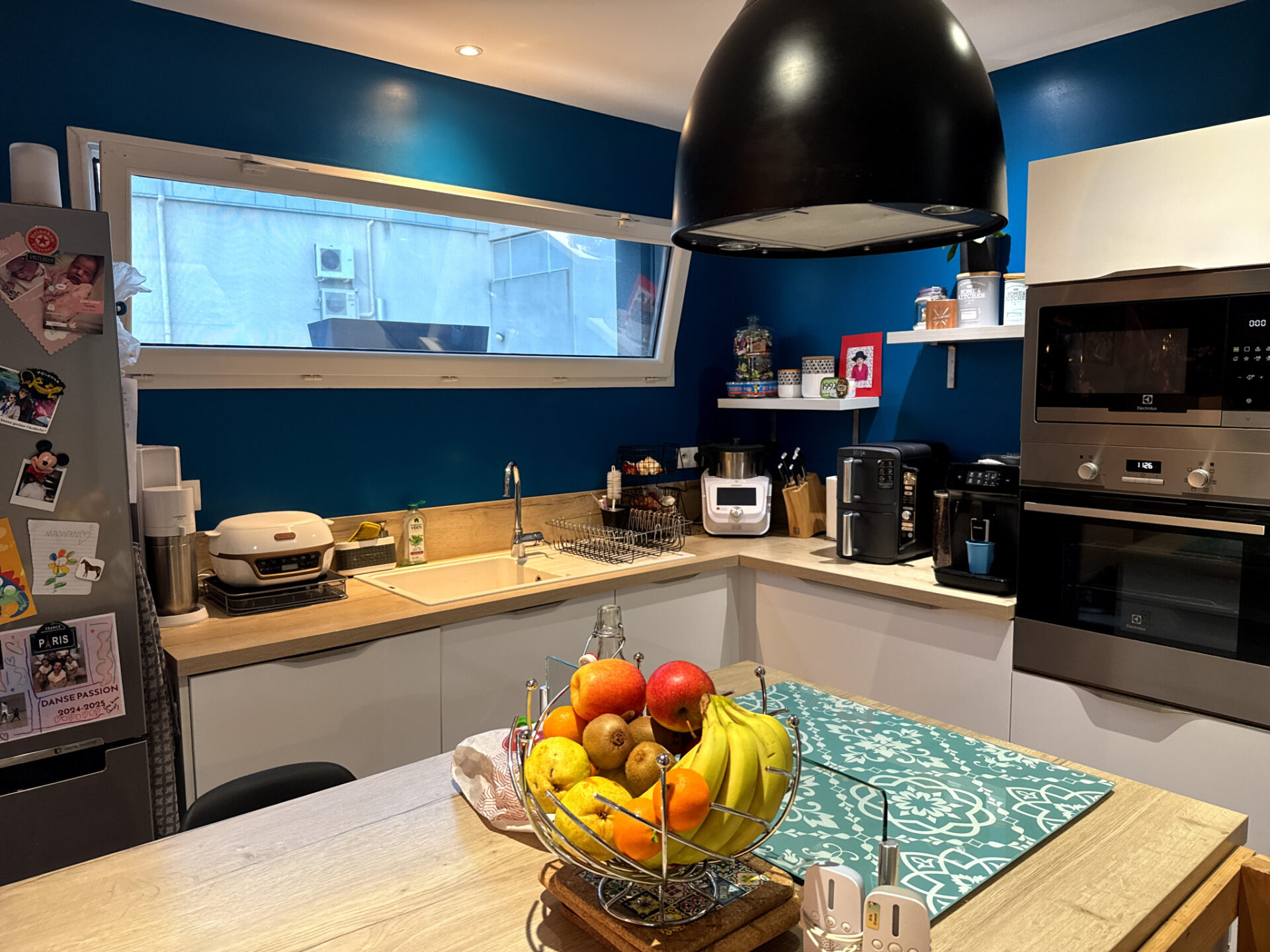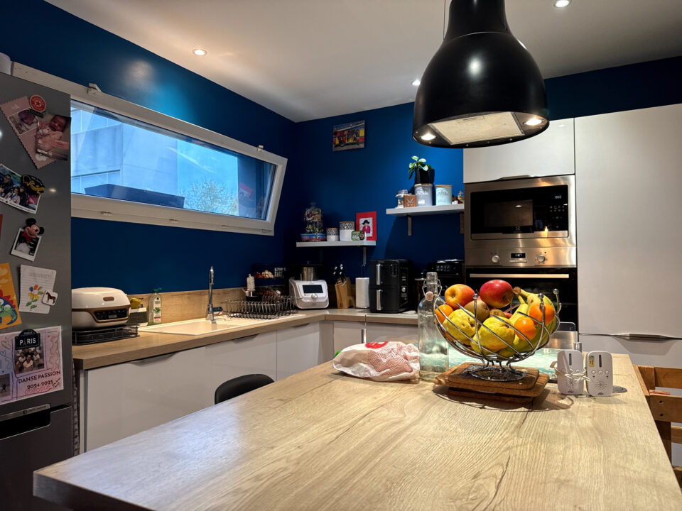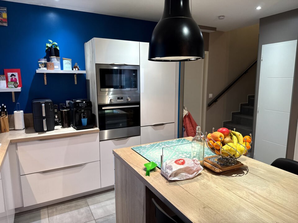 Intérieur fonctionnel : Le rez-de-chaussée s'ouvre sur une cuisine ouverte entièrement équipée sur un séjour lumineux, avec un coin toilette/buanderie pratique.