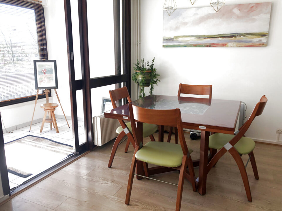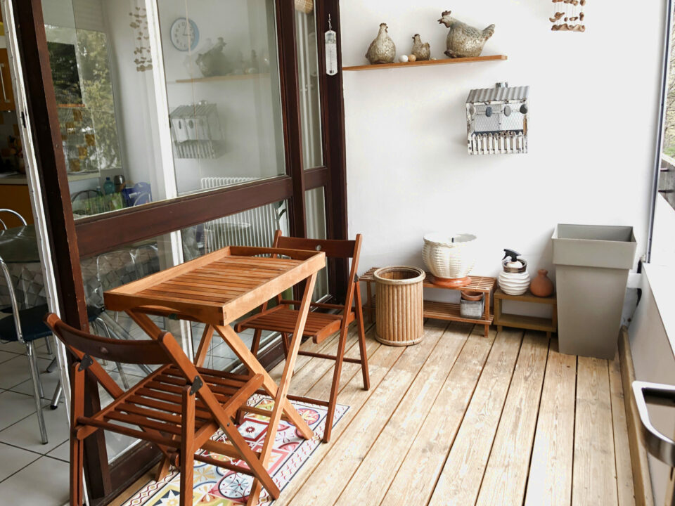La cuisine aménagée offre un espace repas qui se prolonge aussi sur une terrasse avec loggia d'où la vue est tout aussi verdoyante.