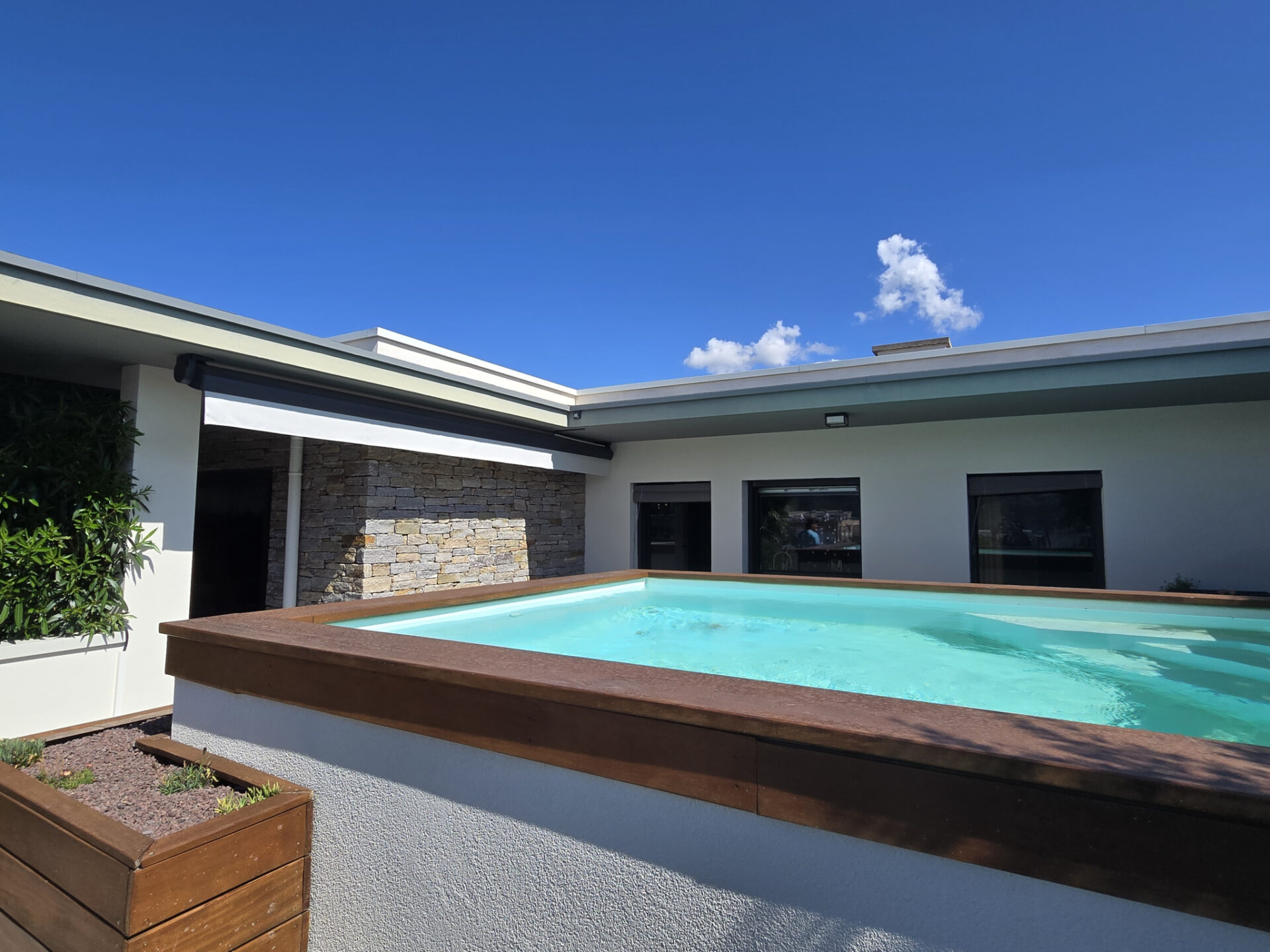 Garage double sécurisé, confort haut de gamme : chauffage & rafraîchissement par le sol, climatisation gainable, huisseries aluminium, volets électriques inclinables.