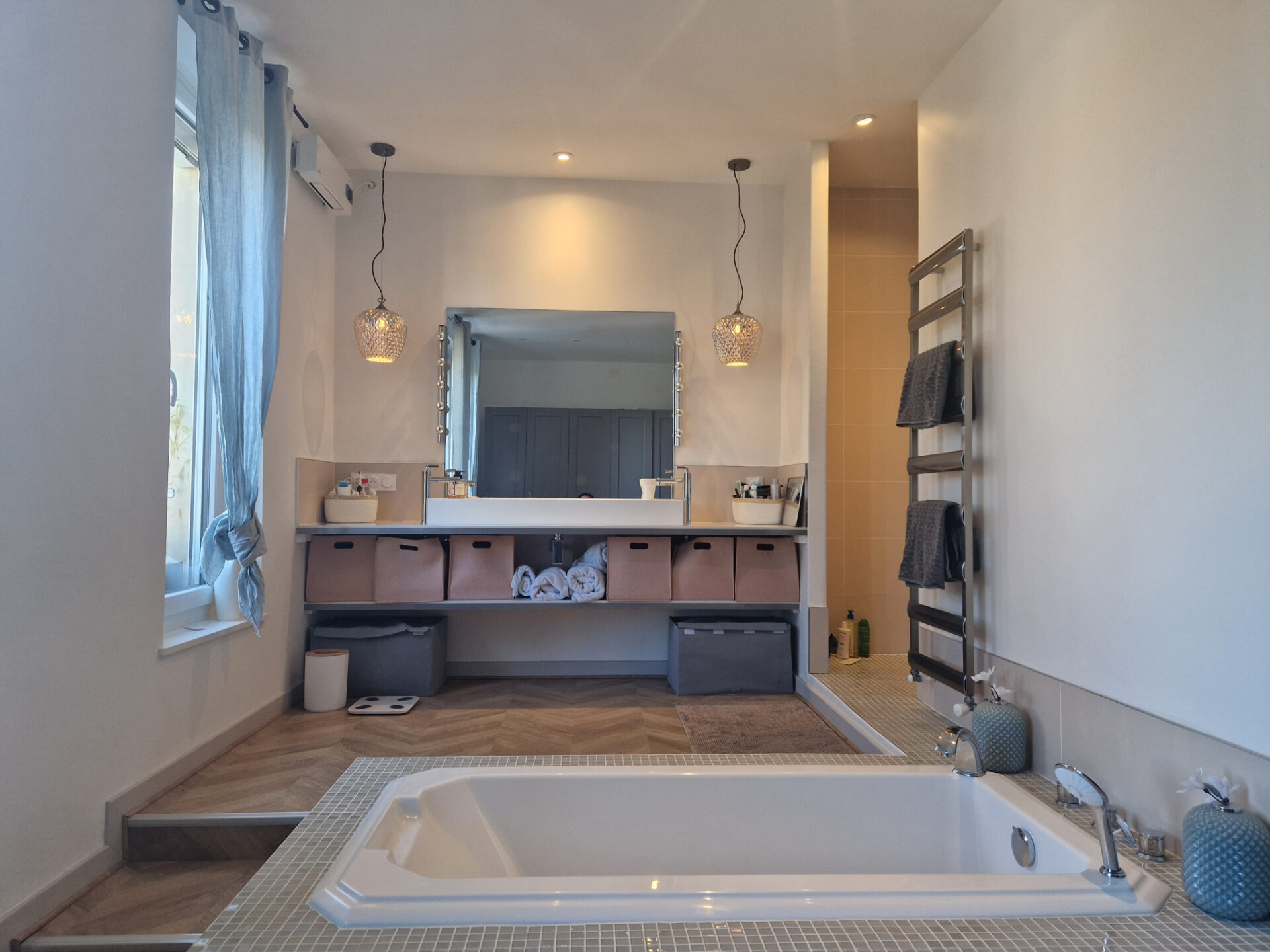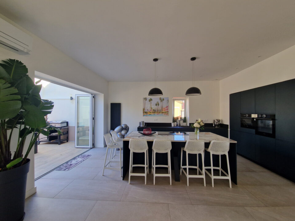 Exceptionnel ! Vente appartement d'environ 200 M2 joliement refait à neuf, avec terrasse exposée Sud/Ouest de 80 M2 sans vis à vis ! Cuisine us équipée, 3 Chambres dont une suite parentale, baies vitrées alu ouvrant sur l'extérieur, climatisation, cave, parking + piscine privative.